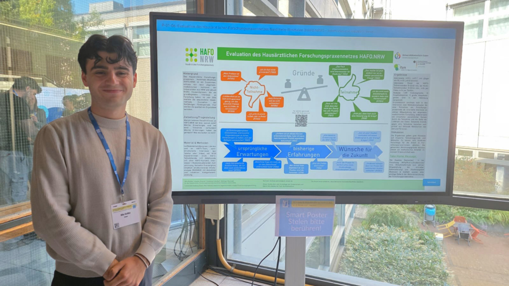 Auch das Essener Team von HAFO.NRW präsentierte die Arbeit des Hausärztlichen Forschungspraxennetzes im Rahmen der DEGAM 2025. Beispielsweise berichtete Nils Koitka, Doktorand am ifam Essen, in Form eines Posters über die Ergebnisse zur Evaluation des Hausärztlichen Forschungspraxennetzes. Im Rahmen dieser Evaluation wurden qualitative Interviews mit Hausärzt*innen in NRW durchgeführt und ausgewertet.