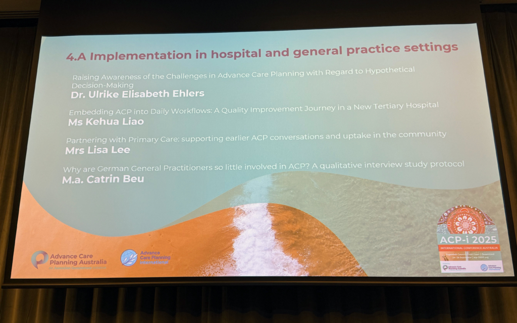 Auch am ifam Essen wird Advance Care Planning, kurz ACP, gelehrt und beforscht. Daher stellten Institutsleiter Univ.-Prof. Dr. med. Jürgen in der Schmitten und Doktorandin Catrin Beu aktuelle Entwicklungen und Forschungsprojekte im Bereich ACP in Deutschland auf der Konferenz vor und nutzten die Möglichkeit, sich mit dem internationalen Publikum darüber auszutauschen.